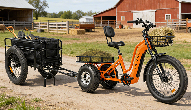 Rural users benefit from the trike’s fat tires, long range, and high payload capacity. Farmers transporting produce to markets appreciate the spacious rear basket and the ability to handle dirt paths and uneven terrain. The three‑wheel design prevents tipping when carrying irregular or delicate agricultural goods. For on‑property logistics, the electric motor eliminates the physical strain of moving tools, feed, or supplies across large areas. Additionally, the Addmotor trailer is fully compatible with the trike, expanding its load‑carrying capability; the electric trike trailer supports up to 220 pounds, making it ideal for heavier agricultural transport needs.